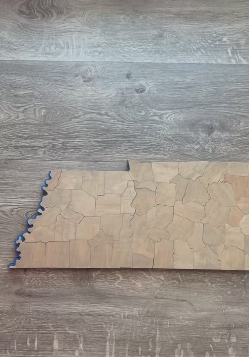 Each map is built by fitting the individually cut counties together to form a single, unified piece. The emphasis is on proportion, balance, and the natural character of the wood rather than visual complexity. Missisippi river is represented on every map, in a bright blue color.